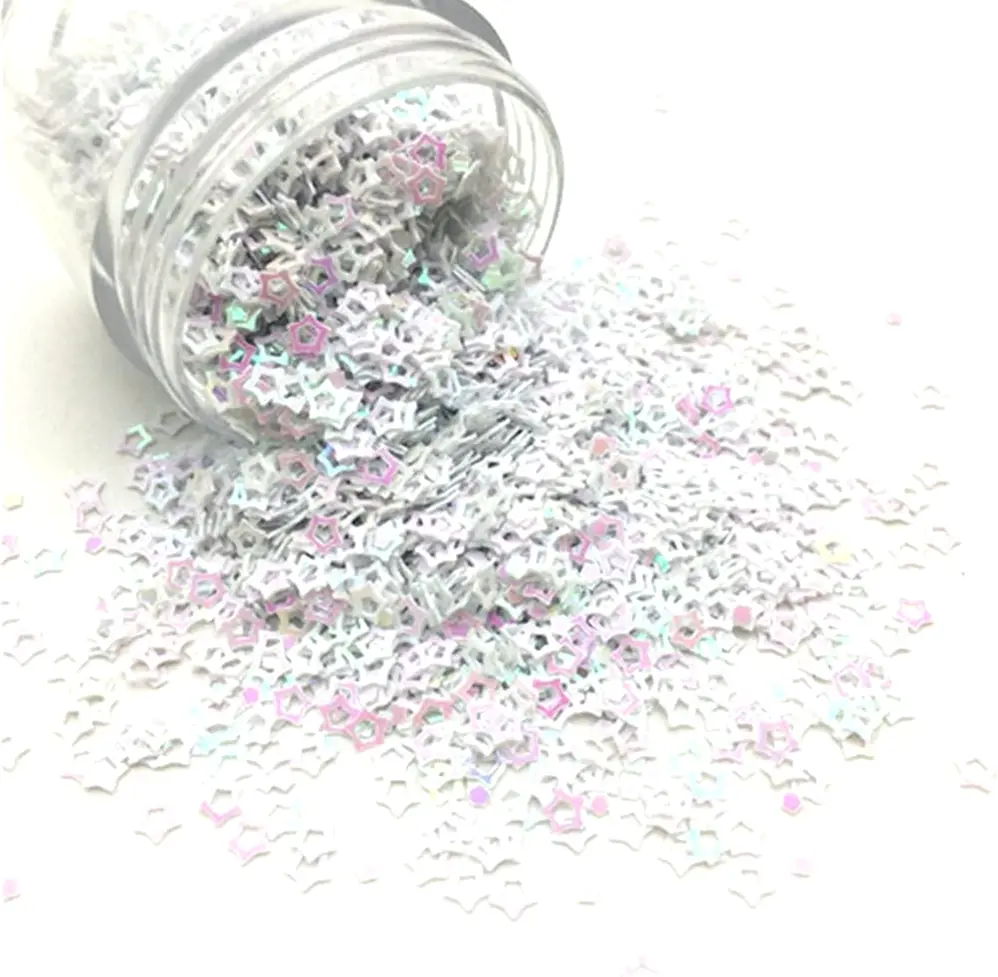 Crafted from high-quality PVC, with a vivid hue, ideal for manicure art and shaker projects. Mini hollow star confetti at 4 mm, featuring Aurora Borealis glitter. Available in 15 colors: transparent, gold, lime green, rose, red, aqua, watermelon, orange, yellow, violet, pink, skyblue, silver, white. Great for multiple arts, includes scrapbooking, shaker card making, card invitation, thank you cards, balloon glitter, table scatters, wedding decor, fashion decorations, nail manicure, mardi gras beads, resin jewelry, face cosmetics, eye makeup, DIY crafts for birthday parties, nuptials, baby showers, various party decorations. Loose Sequins enable to imagine creatively while adding glare, glitz, and glamour to create wonderful clothing or mesmerizing artwork and home decorations. CAUTION: Tiny parts. Not suitable for children under 12 yrs.
