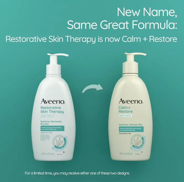 New name, same great formulation: Aveeno Calm + Restore Gentle Everyday Body Wash for delicate skin. The 18-fl. oz. bottle is designed to be sensitivities. With antioxidant oat, aloe extract, and vitamin B5, this wash soothes and nourishes all day. Suitable for daily use, the formula is free from parabens, sulfates, fragrances, and dyes. A part of the collection includes 30% Post-Consumer Recycled Plastic packaging, suitable for delicate and disturbed skin.* Suitable for mild to moderate dry skin in adults undergoing systemic oncology treatment. *