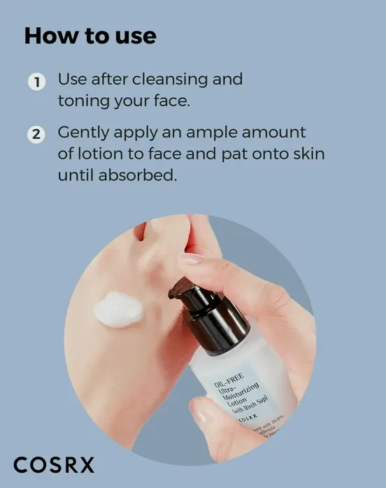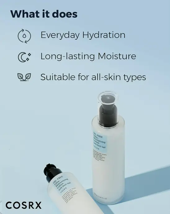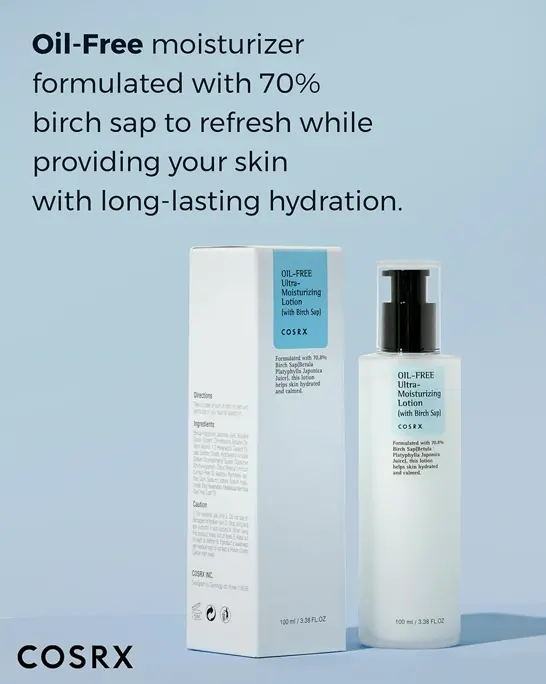 Simple to Use: Ideal for individuals with greasy and combination skin, COSRX Oil-Free Hydrating Lotion can become a daily must-have. This Hydrator is suggested for both nighttime use, providing your skin the care it demands instantly. Hydrate Your Skin Without Grease: Non-greasy and smooth in consistency, the lotion penetrates thoroughly to calm and heal irritated skin while recharging it with vital antioxidants and vitamins. Key Component: Contains 70% natural willow bark water, effective for hydrating properties and maintenance of skin hydration balance. Instant Absorption: Gone are the days when lotion simply sat on your skin with no benefits! This lotion penetrates instantly, leaving your skin rejuvenated, soft, and velvety. COSRX Standards: COSRX formulations are made with skin-friendly ingredients that alleviate sensitive skin. Hypoallergenic, Dermatologist approved, Animal Testing-FREE, Paraben-free, Sulfate-free, and Phthalate-free.