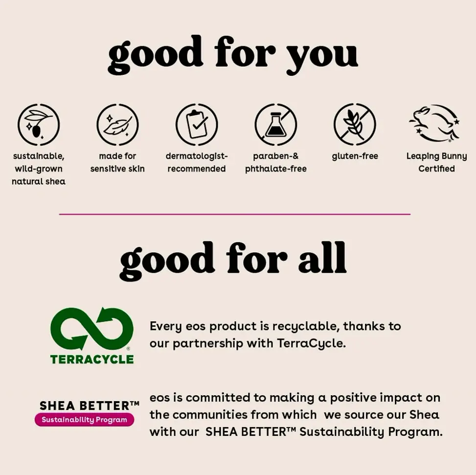 SUSTAINABLY-SOURCED INGREDIENTS: Each eos balm contains naturally grown, sustainably sourced, natural shea butter and oil to leave your lips smooth and nourished