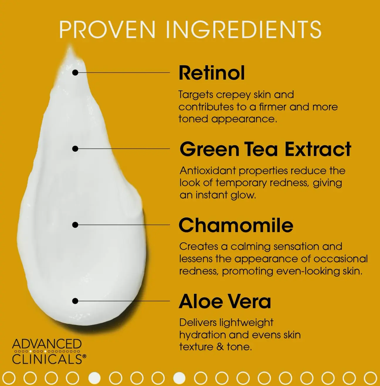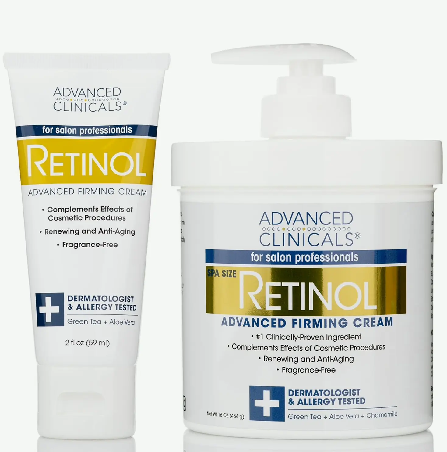 Vitamin A is known to be the #1 Skin Expert suggested anti-aging skincare ingredient. It diminishes deep wrinkles, drooping skin, fine lines, crepey skin, and UV damage while enhancing collagen production. Originally designed for skin treatments, this Retinol Cream is now accessible for anyone looking to revitalize their skin.nThe Expert Clinicals Retinol Cream is infused with Aloe Vera, Chamomilla, Glycerol, and Green Tea, which together tighten skin and reduce the appearance of sun-damaged skin, wrinkles, tiny wrinkles, and crinkly skin. Aloe Vera protects against visible redness and inflammation; Green Tea and Chamomile guard against environmental harm and diminish puffiness.nThis Skin Firming Advanced Cream is proven, dermatologist-tested, and allergy-tested. This non-greasy, fragrance-free formula penetrates easily into the skin, making it perfect for being used as a body lotion and facial moisturizer. Nourish, hydrate, and firm your skin for a healthier, more voluminous, and youthful appearance while also improving your skin’s elasticity.nWith time, our skin reduces elasticity and moisture. This scentless Retinol Moisturizer integrates anti-aging ingredients with natural antioxidants to promote more radiant skin and a more youthful appearance. Unlike most retinol products that come in small 2-ounce jars, this Retinol Cream comes in a sizable 16-ounce spa-size jar and an additional 2-ounce portable size tube.nThis oil-free, animal-friendly, and fragrance-free formula is free from parabens, drying alcohols, animal-derived ingredients, PEGs, sulfates, dyes, and talc. Manufactured in our FDA-regulated and inspected laboratory in Chicago, USA. Beginner Retinol users should test the cream on a small area of the skin and gradually integrate it into their skincare routine, working up to twice daily as accepted. If redness occurs, cut back on frequency; if irritation continues, discontinue use.
