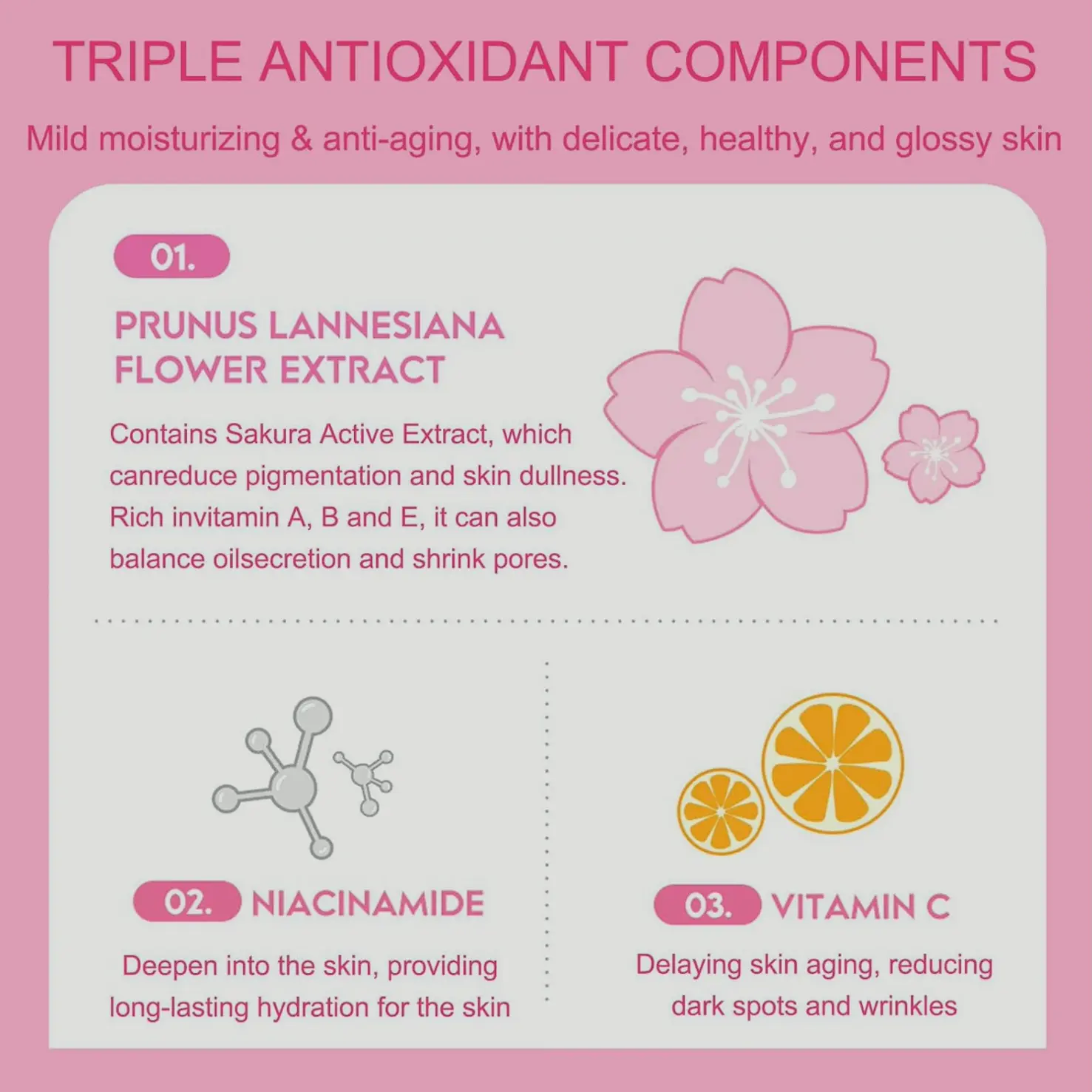 🌸Anti-Aging Set: Rich with sakura extracts and Vit C, this set helps in slowing skin aging, firming the complexion, reducing deep lines, and keeping the skin moist and smooth.