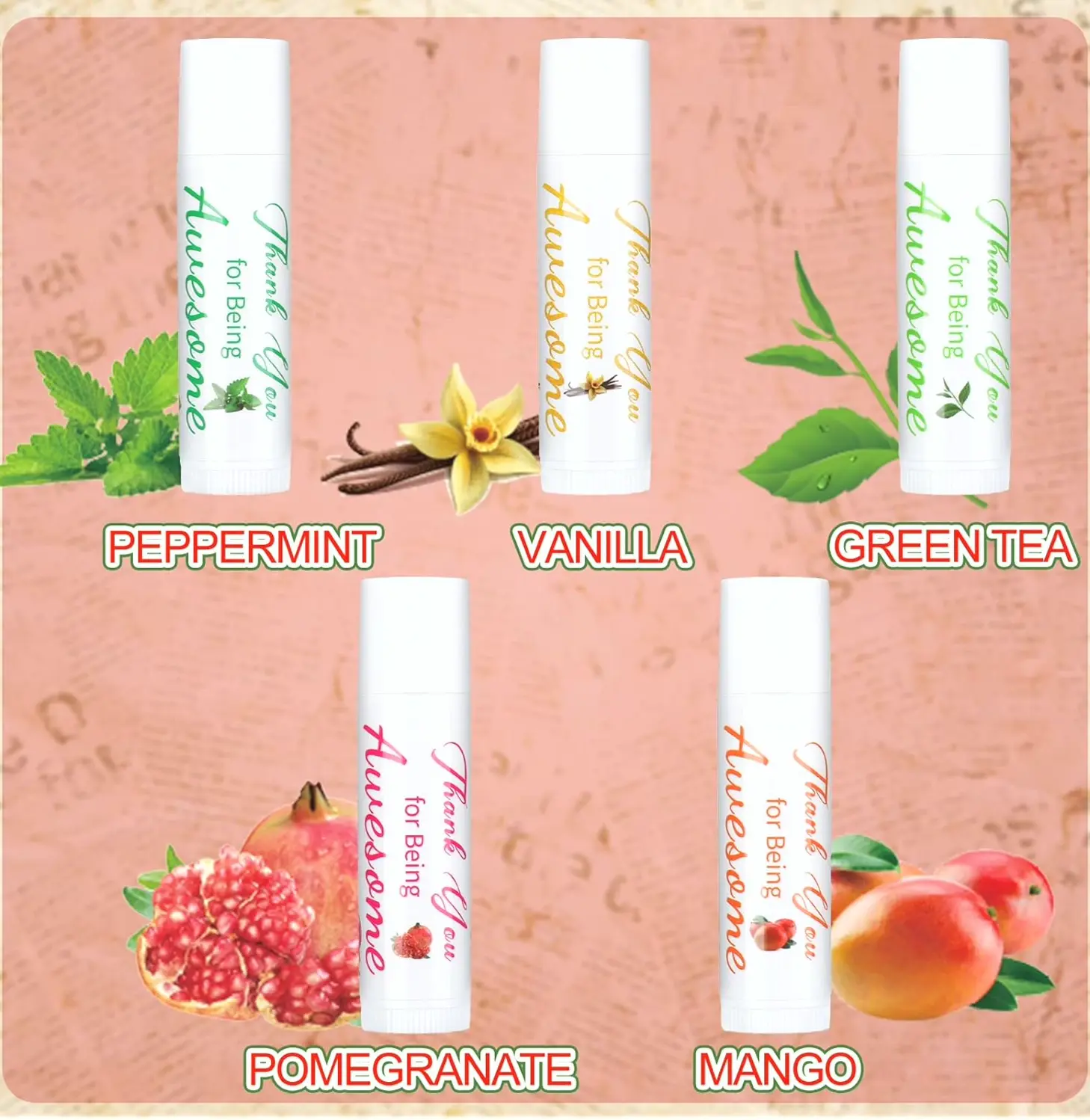 Numerous Variants to Choose: The lip balms come in five assorted options, including peppermint, vanilla, green tea, pomegranate, tropical mango. Each piece is labeled for easy identification, offering a refreshing feeling, moisturizing your lips and leaving your mouth pleasantly scented.