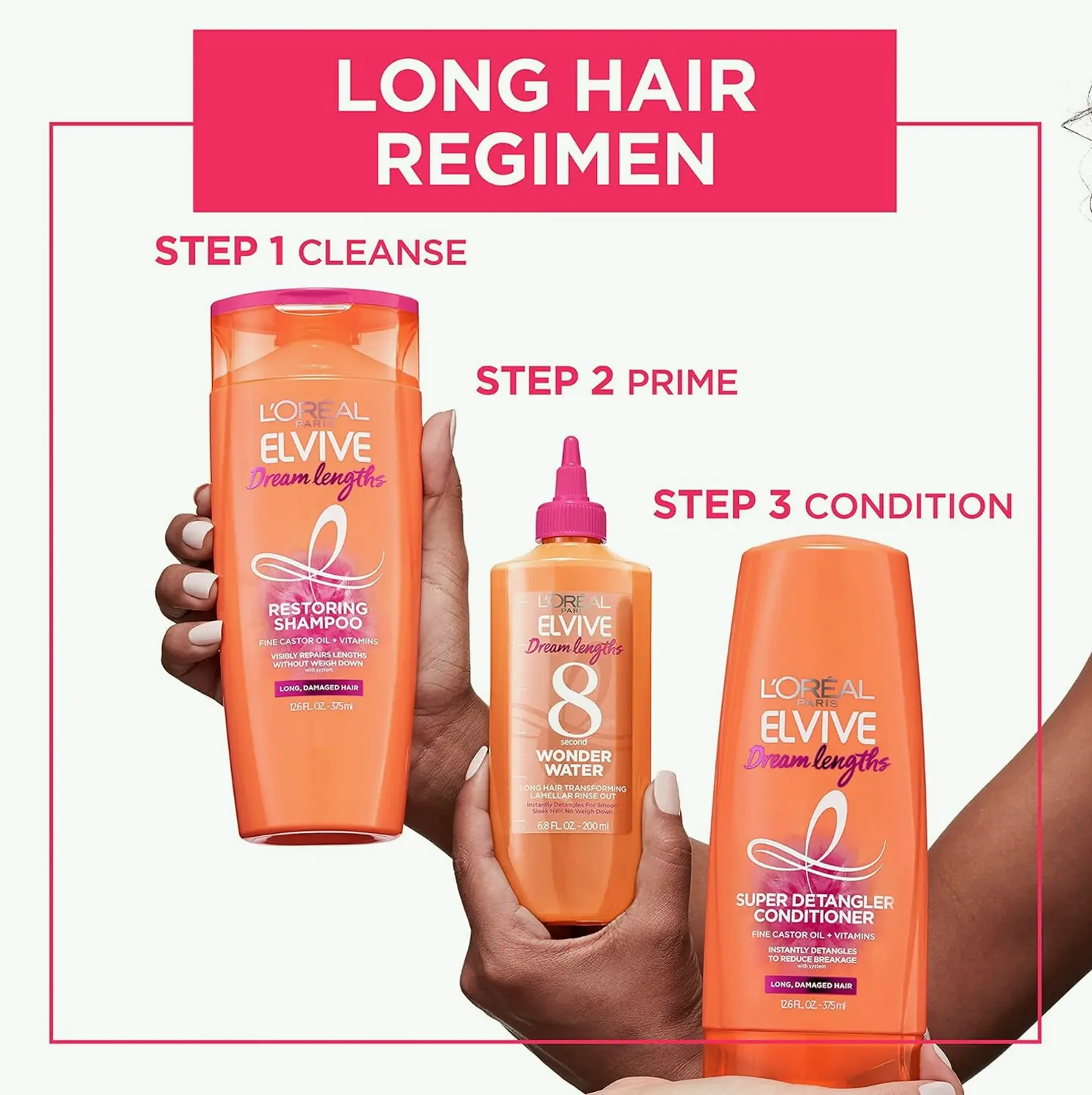 Experience creamy hair wash and detangling hair cream that fixes breakage without weighing down. Adds shine and guards length as it strengthens and fixes split ends. Infused with castor oil and vitamins B3/B5, featuring a sweet floral, fruity scent. Enjoy the complete Dream Lengths range for beautiful hair every day. Your beauty products full with new products from L’Oreal Paris, a top cosmetics brand.