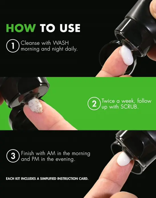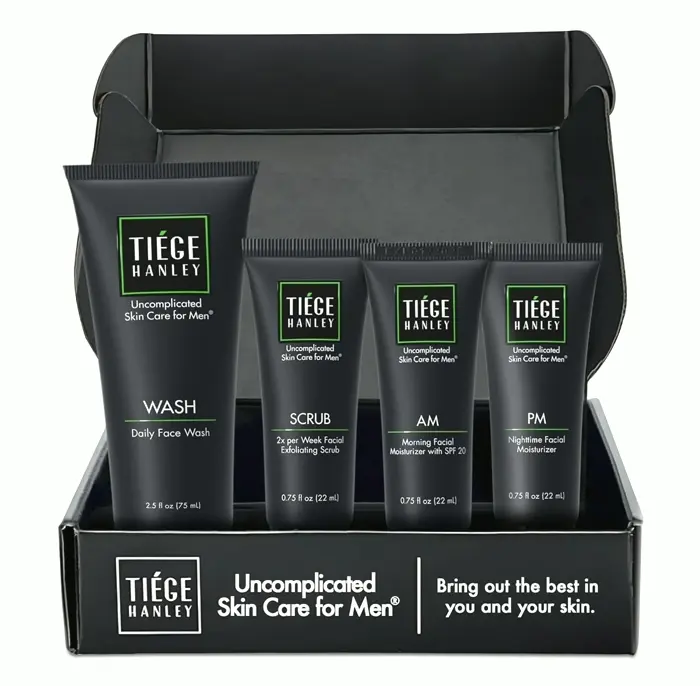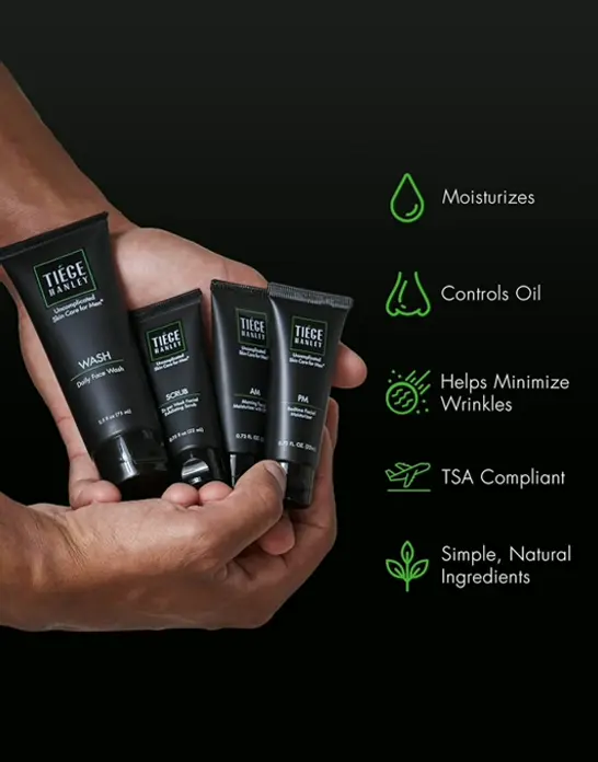 Enhance Your Appearance: Tiege Hanley’s Essential Routine for Guys works in unison to smooth , hydrate , and shield your skin . Includes face wash 2.5oz , exfoliating scrub 0.75oz , AM facial moisturizer with SPF20 0.75 ounces, PM moisturizer 0.75 ounces, and a simplified usage manual. This starter set provides a 30-day supply , perfect as a starter pack for yourself or as a gift.