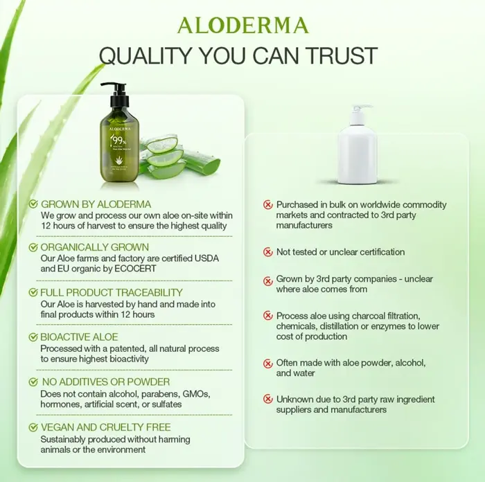 Aloderma: We are a family-operated farm-to-face skin care brand dedicated to producing and creating premium natural aloe vera-based items in an eco-friendly manner. We grow organic aloe on our own farms and manufacture all of our items in our factory, which are certified USDA and European Union natural by ECOCERT. We has over 20 years of experience with Aloe, providing high quality and budget-friendly products for beauty, well-being and wellness.