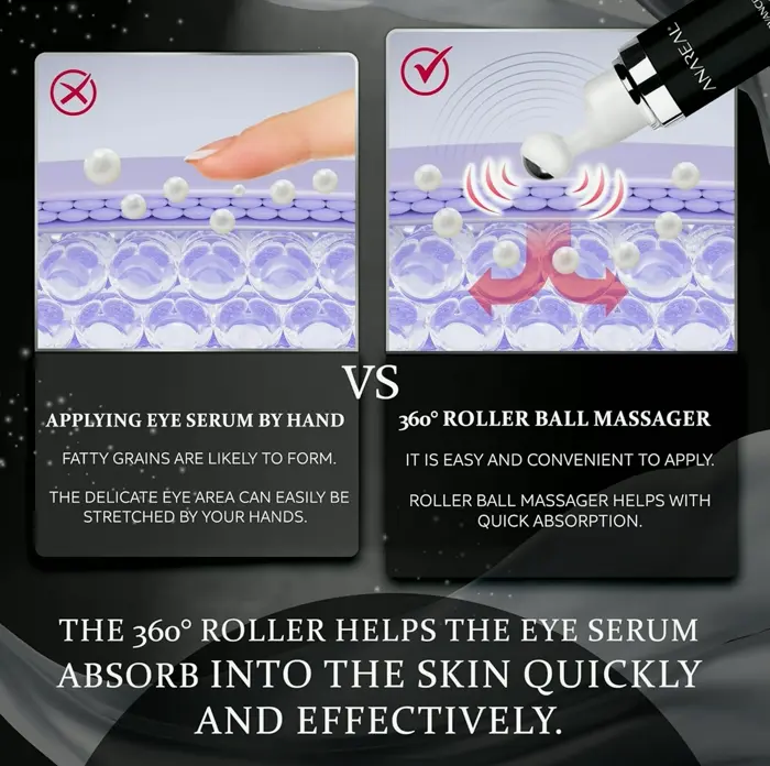 USER-FRIENDLY DESIGN: Our Under-eye Serum for Bags includes a unique 360° cooling stainless steel roller-ball for application. The roller is especially effective when paired with this caffeine-infused eye serum. The Eye Roller for Puffiness and eye bags provides an even spread of the cream around the eyes while |offering a |giving| thorough massage for the eye contour.