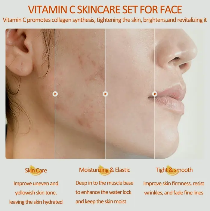 This skin care set contains vital moisturizing necessities: face wash, toner, elixir, facial moisturizer, and eye cream. Successfully reduces wrinkles, tightens skin, reduces pores, and keeps skin moist, full, and shiny. Vit C serves as a organic ingredient, slows aging, lessens spots, and maintains skin flawless. Comes in a luxurious present box, ideal for gifting to relatives and friends on special occasions. Filled with vitamin C, hyaluronic acid, and aloe for profound hydration. Perfect for all skin types, including sensitive to dry.